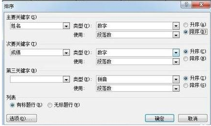 步骤五:可以在排序的对话框中,选择姓名这个栏目,之后选择数字,笔划,拼音,日期,进行排序,同时也可以选择次关键字,进行两轮的排序
