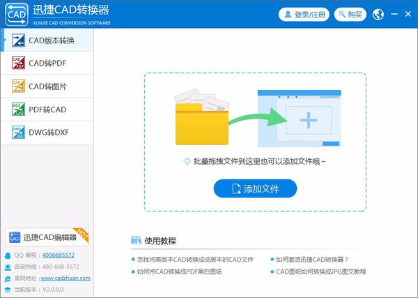 第二步:软件下载安装完成后,运行迅捷CAD转换器,在软件操作主界面的左侧,会看到5个功能选项“CAD版本转换”、“CAD转PDF”、“CAD转图片”、“PDF转CAD”、”DWG转DXF”。我们点击选择第四个选项“PDF转CAD”,然后我们点击“添加文件”,将要转换成PDF的CAD文件添加进该软件的操作界面上。