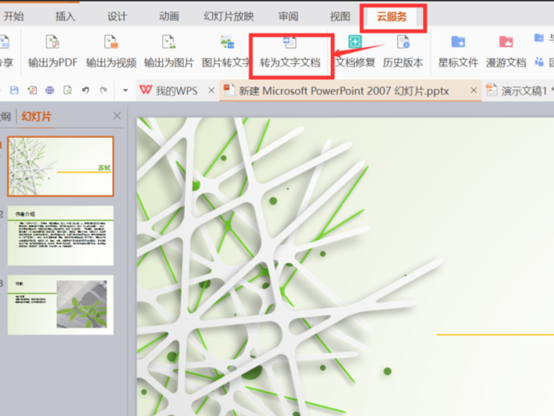 2、在菜单栏的“云服务”里找到“转为文字文档”