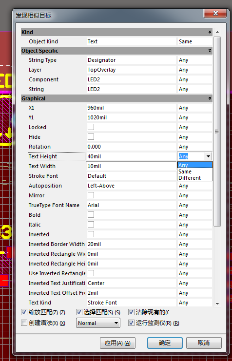 将要修改的标识号原始尺寸后的some改为any,点击确定自动弹出PCB Inspector对话框,如下: