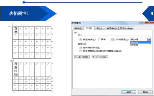 如图表格中百度经验的经验不显示,这时可以右击-表格属性-行(尺寸)不要选定固定值。