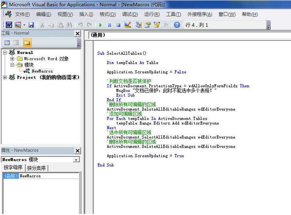If ActiveDocument.ProtectionType = wdAllowOnlyFormFields Then MsgBox "文档已保护,此时不能选中多个表格!" Exit Sub End If