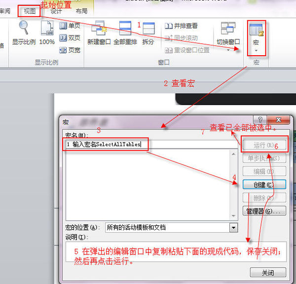 2 word---视图---宏----查看宏----输入宏名:SelectAllTables----点击创建(参图1)