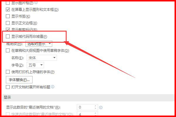 4、在高级菜单中找到显示域代码而非阈值选项,取消勾选即可。