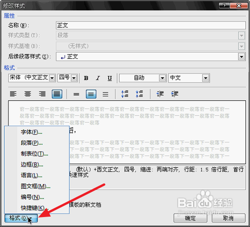 对样式的修改。点击修改之后,会出现下图的窗口,正如之前指出的,样式是格式的集合,我们可以在左下角的格式修改框中修改这个样式中包含的所有格式,包括字体格式、段落格式等。