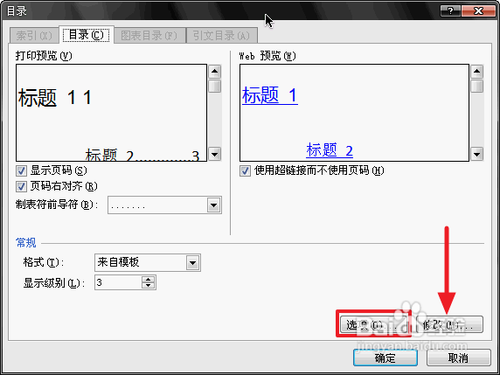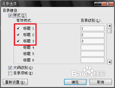 目录选项。点击上图的“选项”按钮,可以选择用哪些样式来生成哪个级别的目录,如下图所示,在图中所示的是标题1-3分别为1-3级目录,如果没有目录级别则不出现在目录中。