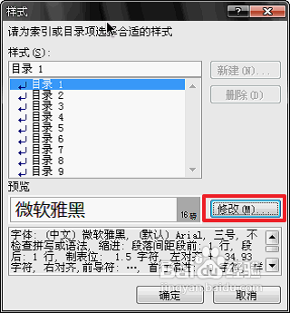 修改目录样式。点击步骤3图中的“修改”按钮,可以修改目录1-9的样式,也就是其呈现的方式。
