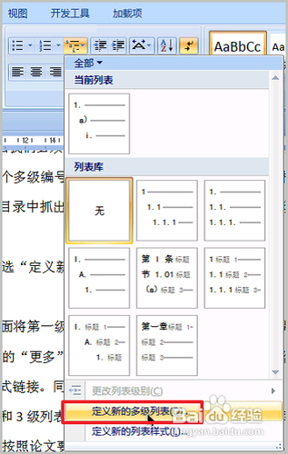 新增多级列表。在“多级列表”中,点选“定义新多级列表”,如下图所示。