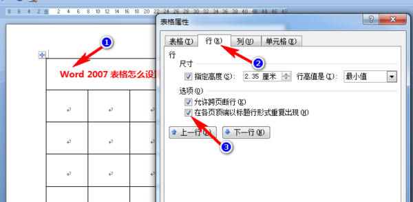2、在打开的Word2007“表格属性”对话框中,切换到“行”选项卡。选中“在各页顶端以标题行形式重复出现”复选框,并单击“确定”按钮即可。