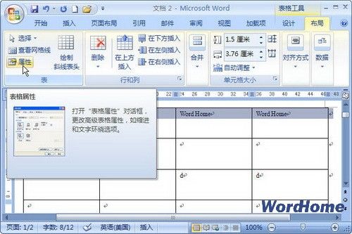 1、打开Word2007文档窗口,在Word表格中选中标题行(必须是表格的第一行)。在Word2007“表格工具”功能区切换到“布局”选项卡,然后在“表”分组中单击“属性”按钮。