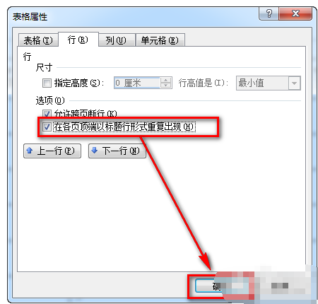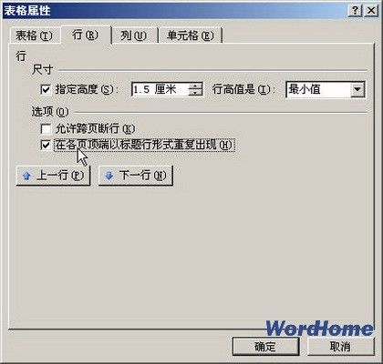 2. 在打开的“表格属性”对话框中,切换到“行”选项卡。选中“在各页顶端以标题行形式重复出现”复选框,并单击“确定”按钮即可,如图2所示。