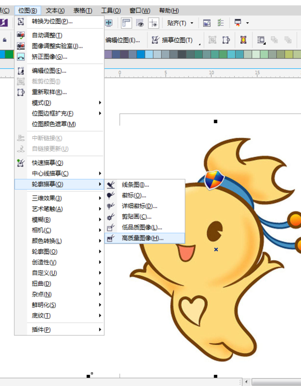2:选中图片选择位图--轮廓描摹--高质量图片--确定,这个就是矢量图片了。如图: