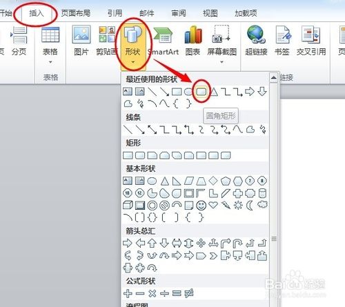 第一步:打开word,新建空白文档,点击菜单【插入】,切换到面板后,单击选择【形状】,在下拉菜单中选择 圆角矩形 。