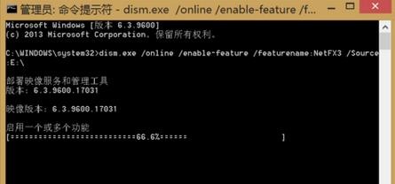 ③输入以下代码,并按回车键:dism.exe /online /enable-feature /featurename:NetFX3 /Source:E:\sxs