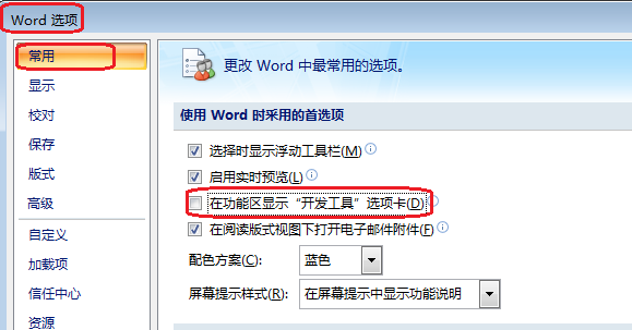 依次点击“office 按钮”、“word 选项”,在”常用“选项中,勾选“在功能区显示‘开发工具’选项卡“,”确定“。