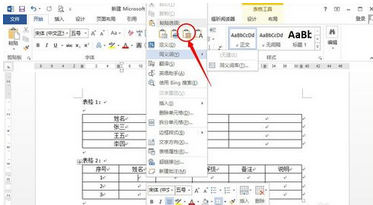 4.在表格2处右击单元格,在选择性粘贴中选项中选择“覆盖单元格”;