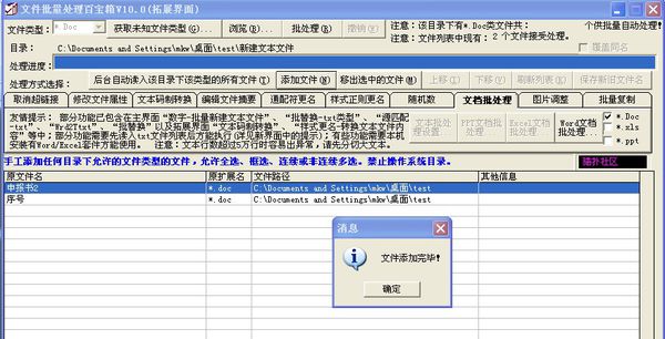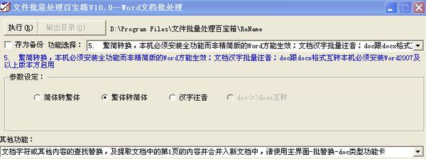 试试 文件批量处理百宝箱V10.0-主界面-右上角-更多功能-拓展界面-文档批处理功能卡-doc类型-第5项功能,doc=docx互转功能。如图所示: