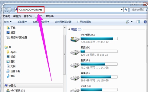 2、点击“计算机”,进入根目录。复制引号内内容“C:\WINDOWS\Fonts“,点击一下上方地址栏,然后使用“ctrl+v”或者是右键点击,选择“粘贴”,粘贴“C:\WINDOWS\Fonts”。粘贴之后点击“回车键”,进入到windows字体库中。