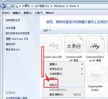 4、返回到刚才打开的windows字体库,使用“ctrl+v”或者是右键点击空白处,选择“粘贴”,粘贴字体。