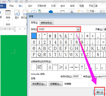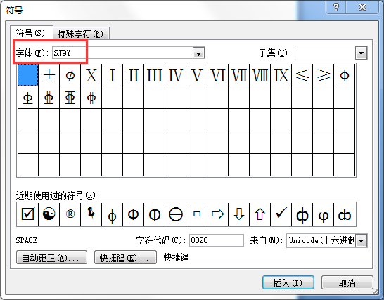 下载安装SJQY字体,然后,插入--符号--符号,“其他符号”,如图: