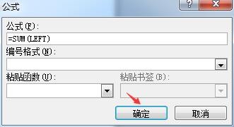 第2步,在打开的“公式”对话框中,“公式”编辑框中会根绝表格中的数据和当前单元格所在位置自动推荐一个公式,例如“=SUM(LEFT)”是指计算当前单元格左侧单元格的数据之和。用户可以单击“粘贴函数”下拉三角按钮选择合适的函数,例如平均数函数AVERAGE、计数函数COUNT等。其中公式中括号内的参数包括四个,分别是左侧(LEFT)、右侧(RIGHT)、上面(ABOVE)和下面(BELOW)。完成公式的编辑后单击“确定”按钮即可得到计算结果.