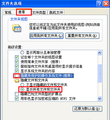 2、然后选择“查看”,将“隐藏受保护的操作系统文件(推荐)”前面的勾取消,然后将“显示所有文件和文件夹”勾上,最后“确定”。