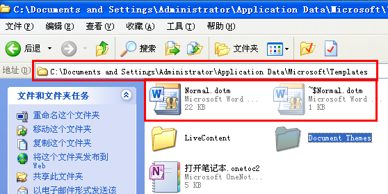 3、完成上面之后,打开路径:C:\Documents and Settings\Administrator\application data\microsoft\templates ,你会看见两个文件,将“Normal”删除掉就可以了。