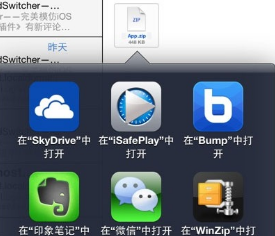 通过网页或邮箱的附件或云存储或任何应用打开zip文件,会发现有一个选项是 WinZip 中打开,点击【在 WinZip 中打开】按钮