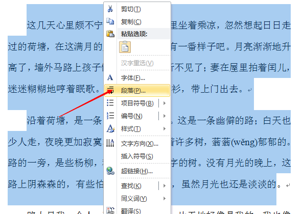 1、选中这些段落,右击,选择“段落”。