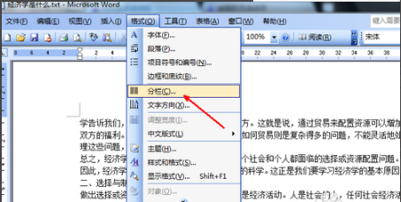 3、点击格式之后,会弹出一个菜单,有许多个选项,其中有一个分栏,我们用鼠标点击一下打开它。