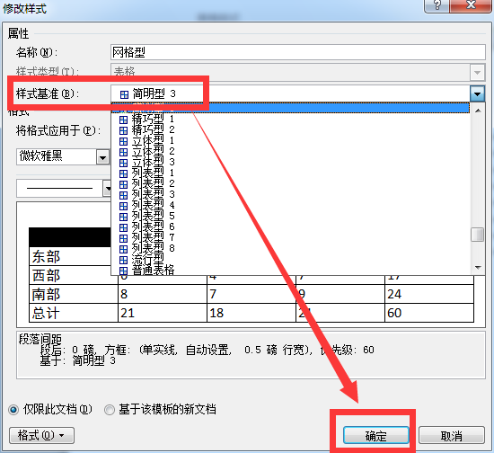 打开“修改样式”的界面后,点击“样式基准”一栏,在下拉列表里选中需要的“简明型3”,最后点击“确定”即可。