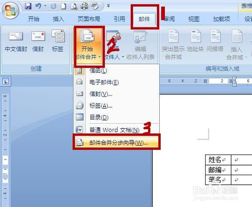 2.在菜单栏----邮件菜单----开始邮件合并----邮件合并分步向导,在文档的左边出现“邮件合并”对话栏。