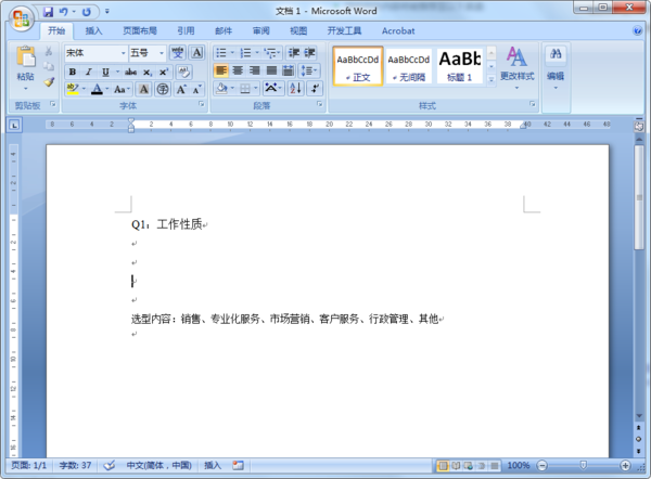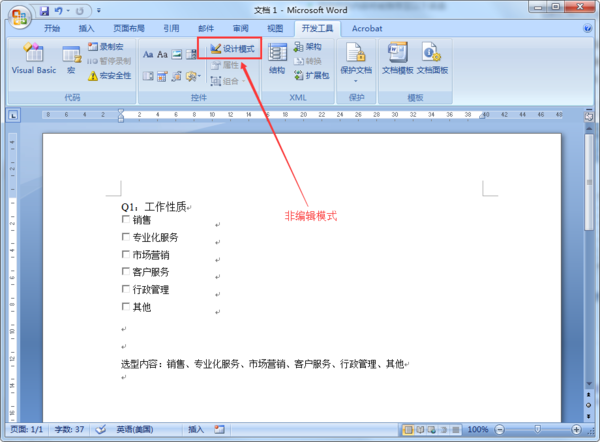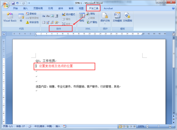 以2007版WORD为例,在下图中的“工作性质”下面设置选项,在选项前设置方框且通过点击选项自动在前面的方框中打勾