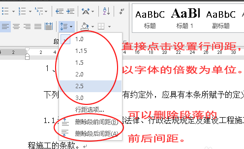 4、在弹出的菜单中可以直接快捷设置相应的行间距,单位是字体高度的倍数;