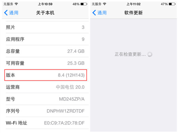 在“关于本机”中可以查看到手机系统的版本号,这里是iOS 8.4。如果不是最新的版本的话,可以返回“通用”,点击“关于本机”下的“软件更新”,系统会提醒你下载最新的固件,按照步骤更新即可。