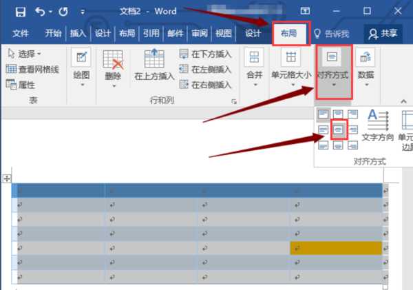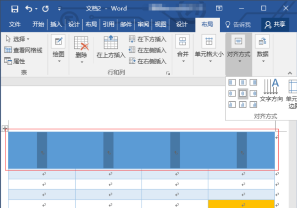 6、这时候文本更改位居中对齐,接着选中表格首行,然后更改文字方向。