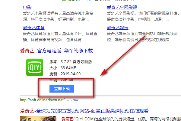 2、在跳转的页面中,找到爱奇艺的下载地址,然后点击立即下载,当下载进度条达到百分之百,就说明爱奇艺已经下载完成。