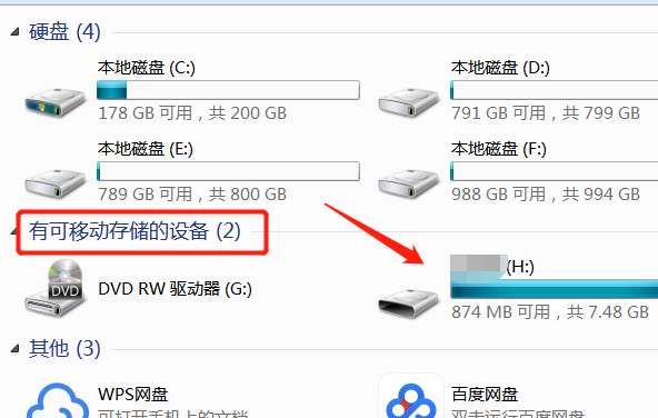 1 把u盘插入电脑usb插口中,系统会自动检测并安装u盘驱动,安装好以后,鼠标点“计算机”图标。