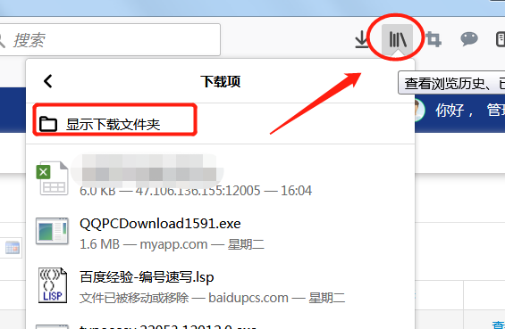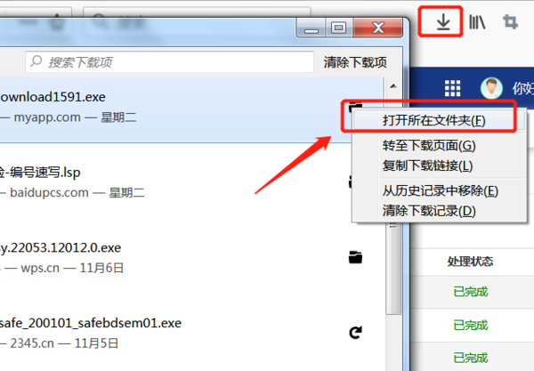 4、如果想在浏览器下载文件到U盘,可以直接下载需要的文件到电脑默认路径下然后点击浏览器右上角的下载箭头找到下载文件复制粘贴到U盘文件夹下。