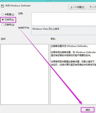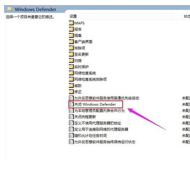 3、双击上图箭头所示的“关闭windows defender”选项,配置为“禁用”再点击确定;