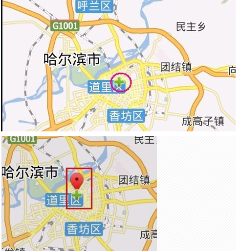 设置好后回到软件主界面,点击左上角红色圈圈住的按键定位,看定位后的图片,一个滴水倒挂状的红色标志,定位在哈尔滨市道里区。