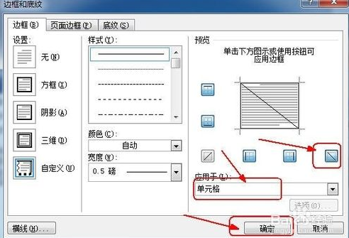 打开“边框和底纹”对话框,在“预览”栏中选择“斜线”,在“应用于”下拉列表中选择“单元格”选项,单击“确定”按钮,如图所示。