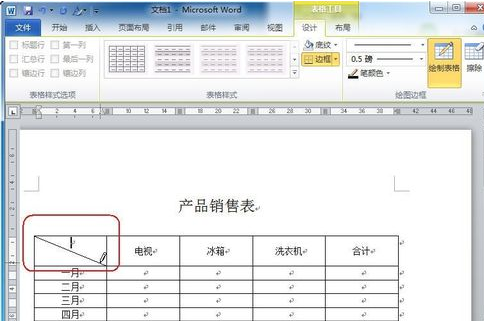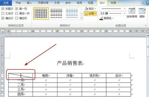 接下来,就是绘制斜线表头了。首选,我们看一根斜线的表头。把光标停留在需要斜线的单元格中,然后点击上方的设计——》边框——》斜下框线