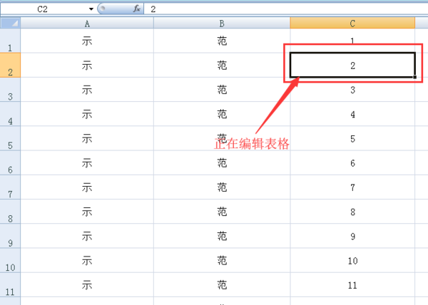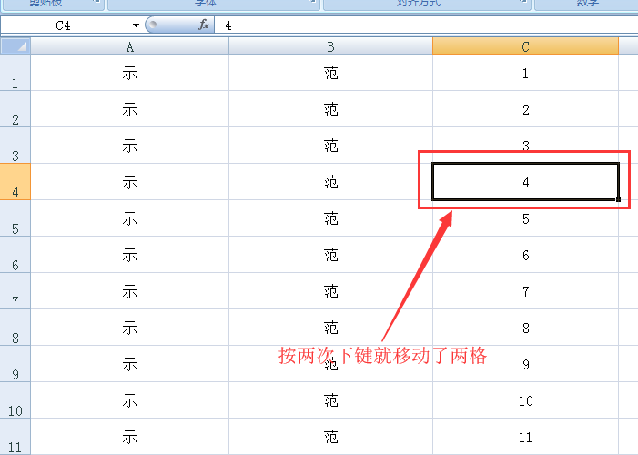 二、这时按下两次方向键的“下键”,编辑格这时会向下移动了两格。