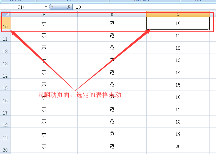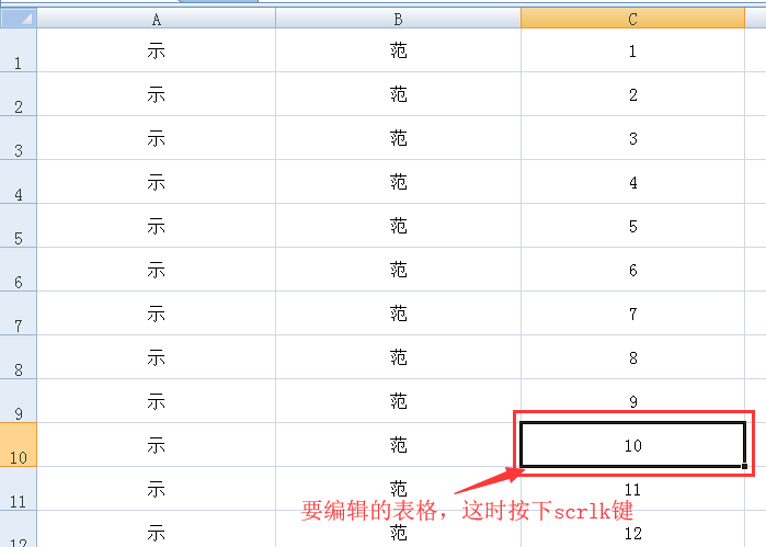 三、有的时候下想要不移动编辑格却能够翻页的话,这时就需要用到“scroll lock”键,以下图为例选定“10”,然后按下“scroll lock”键。