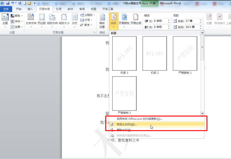 5、还可以自定义水印,点击水印---自定义水印,如图所示;