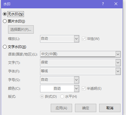 6、在弹出的水印对话框中可以看到需要设置的选项,如图所示: