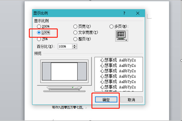 3、在弹出的显示比例设置框里,显示比例勾选100%,这是正常的显示比例,你也可选择其他的比例或者自定义百分比,然后点击下面的确定;