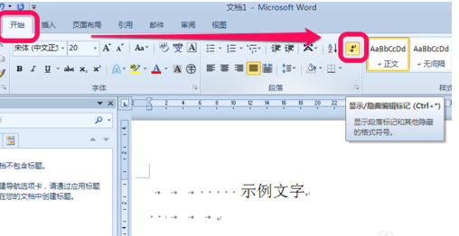 1、打开word文档,看到word的功能选项卡里的开始下面,如图所示,有一个“显示/隐藏段落标记和其它隐藏的格式符号”的按钮,如果显示亮了就表示显示,点击不亮了,就表示不显示;