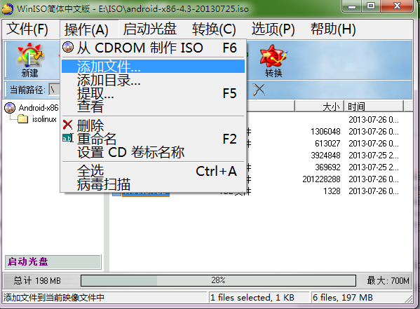 2、对于.iso后缀的镜像, 是符合ISO 9660标准的光盘镜像文件格式,一般可以使用winiso这款软进行修改,该软件是第一个能够直接编辑SO等几乎所有格式映像文件的软件,功能非常强大,如下图所示,在操作菜单中可以看到能完成删除、添加、提取、查看等基本的编辑操作。